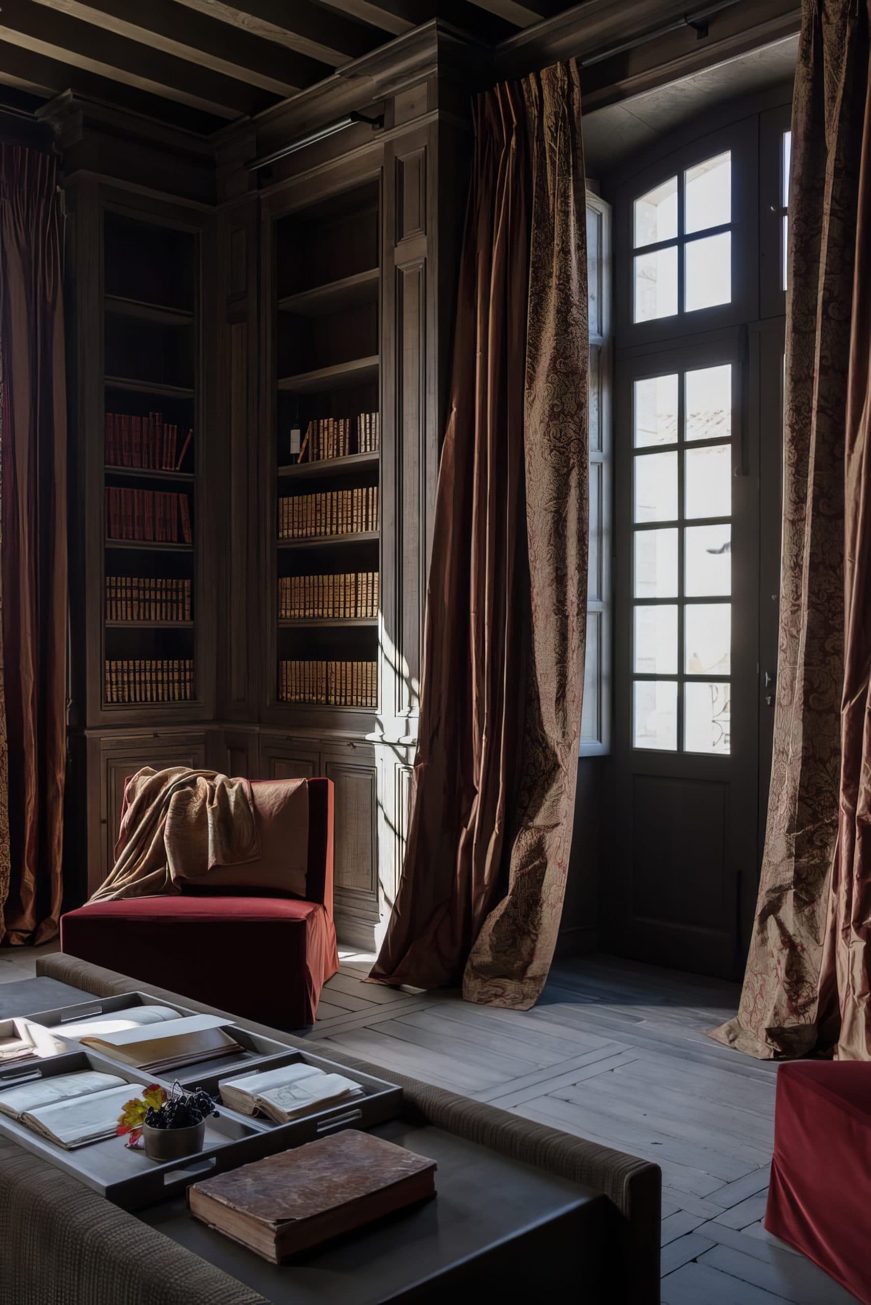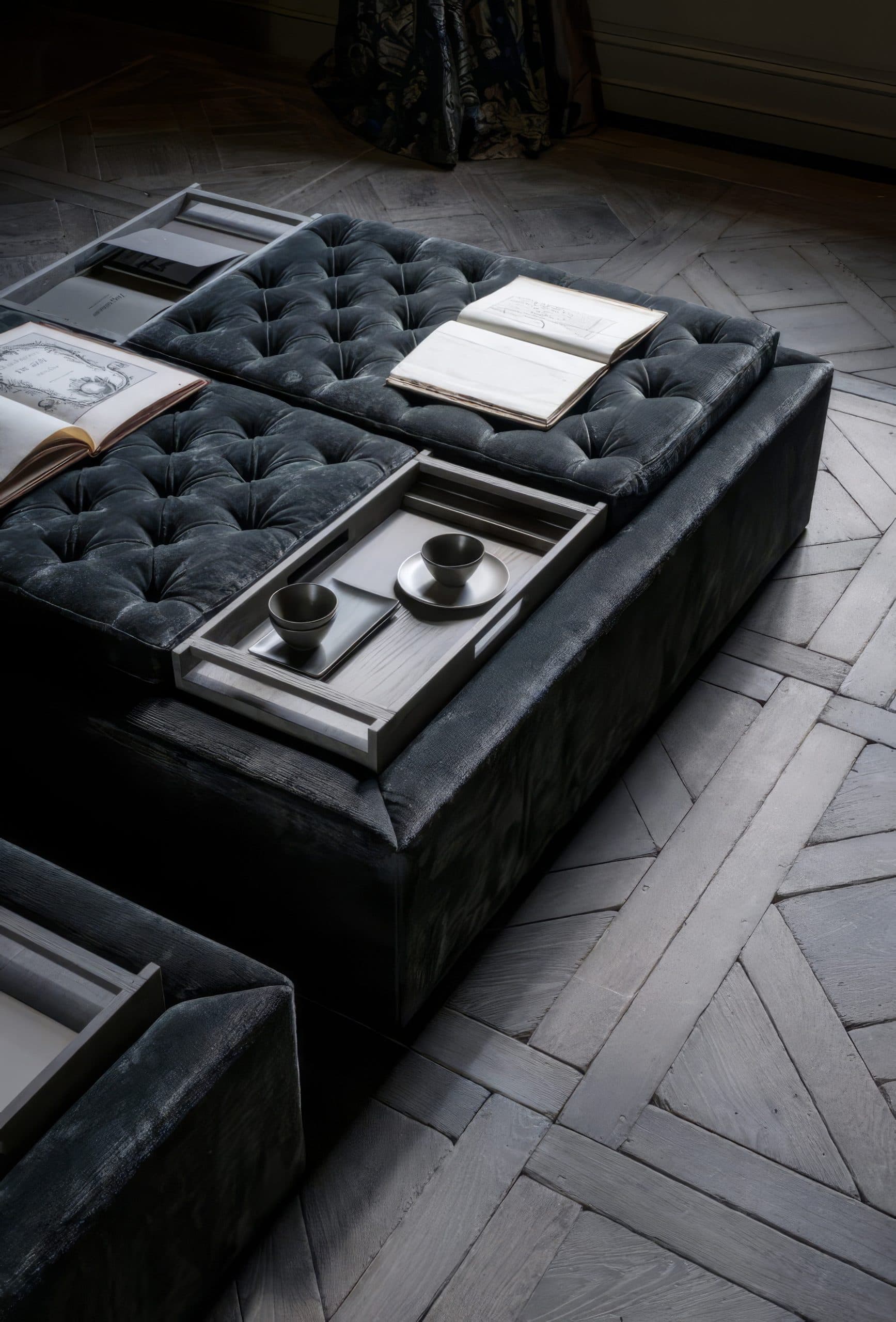 Behold a rare commission: the revival of a 17th-century French castle, finished with our Harvested European Mountain Oak in a bespoke grey patina. Rather than specifying genuine reclaimed timber, this project demonstrates how our colour science can honour an ancient interior with newly quarried wood. Working alongside local finishers and colourists, we have developed mineral-based pigments and organic formulations that bond with the grain to achieve nuanced, naturally aged tones. The surface is tuned through a sequence of slow, hand-worked steps until the hue aligns precisely with the client’s brief. Floors, doors, walls and tables were completed by hand in situ. A living example of slow design: handmade, historically sympathetic, and engineered to endure.