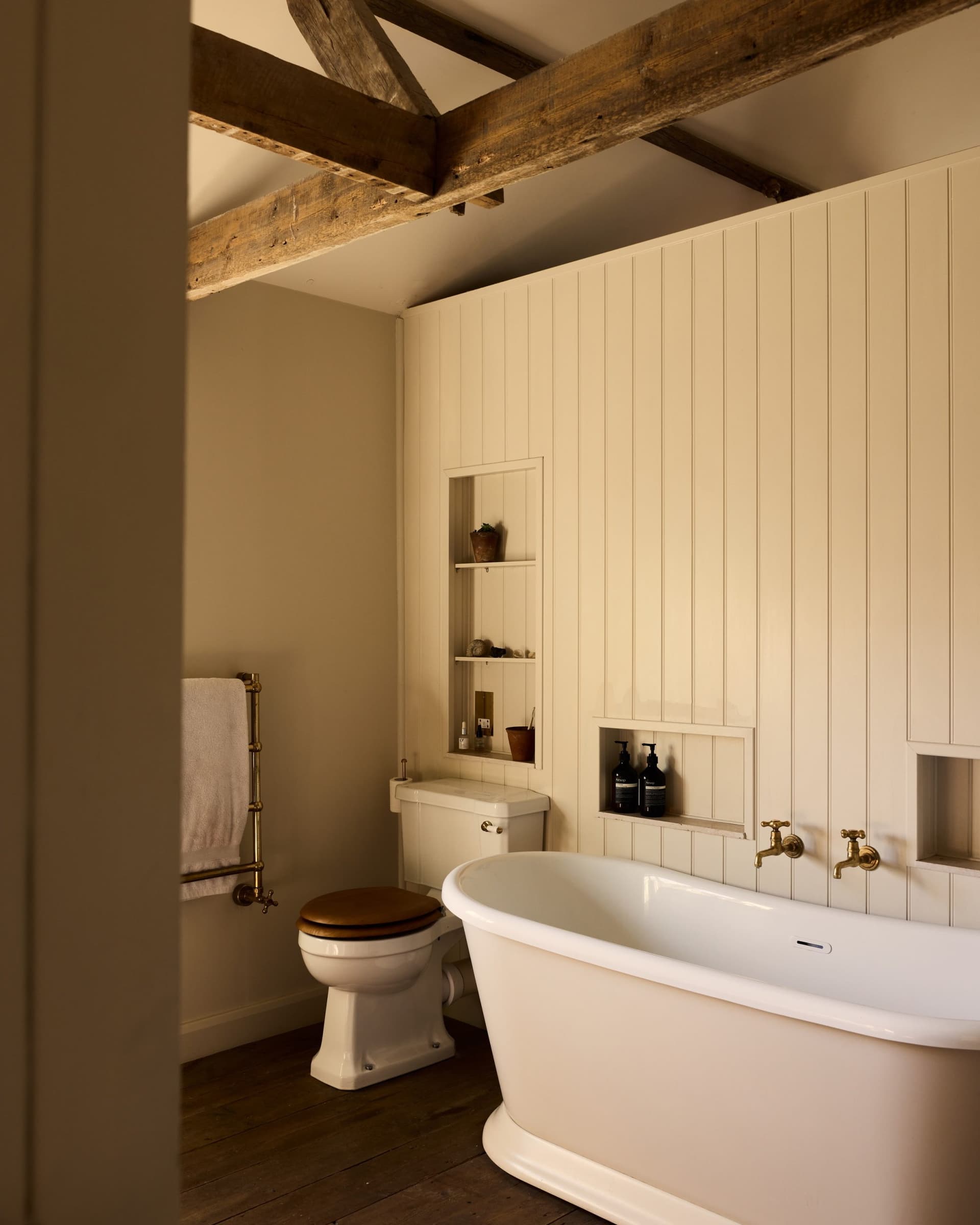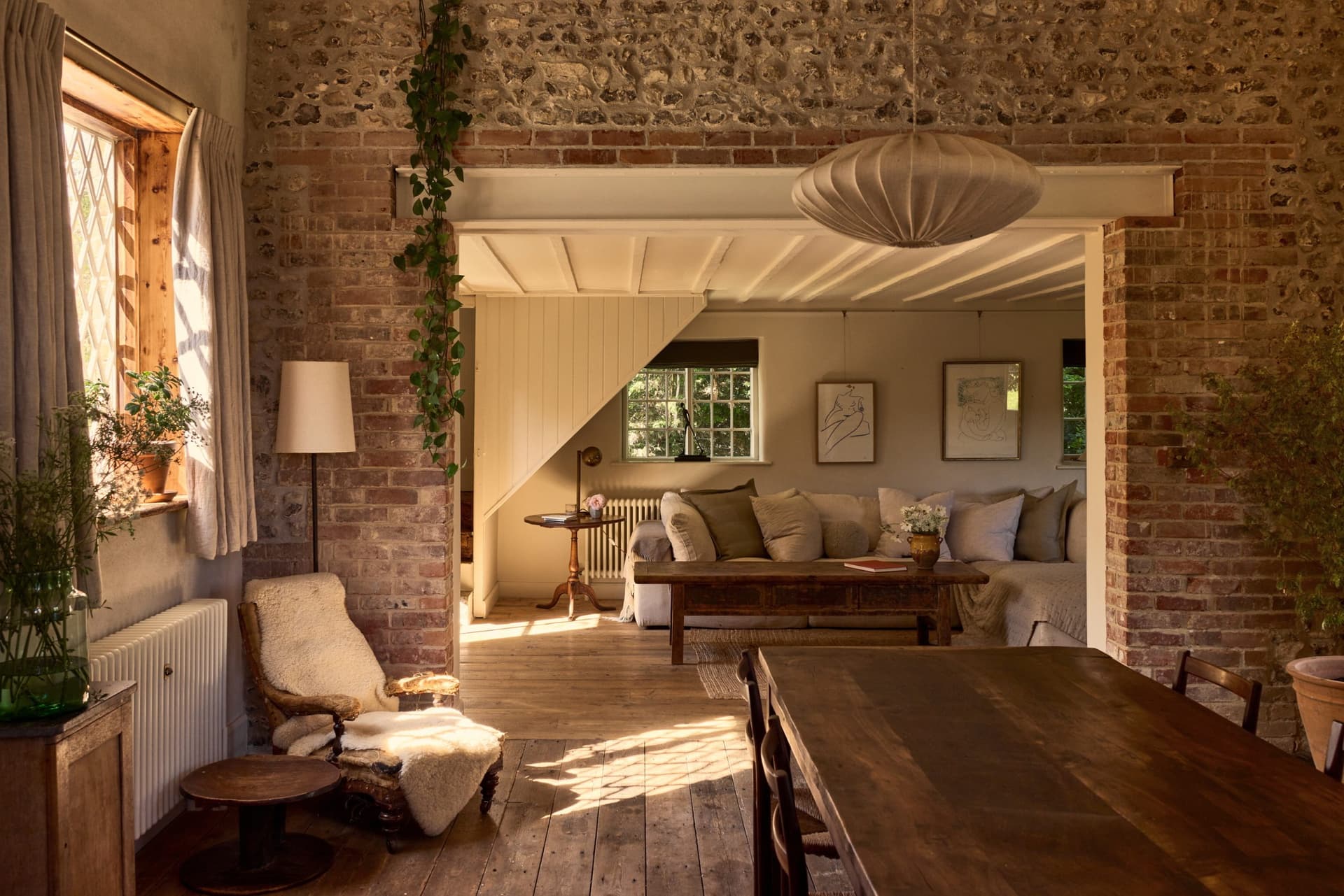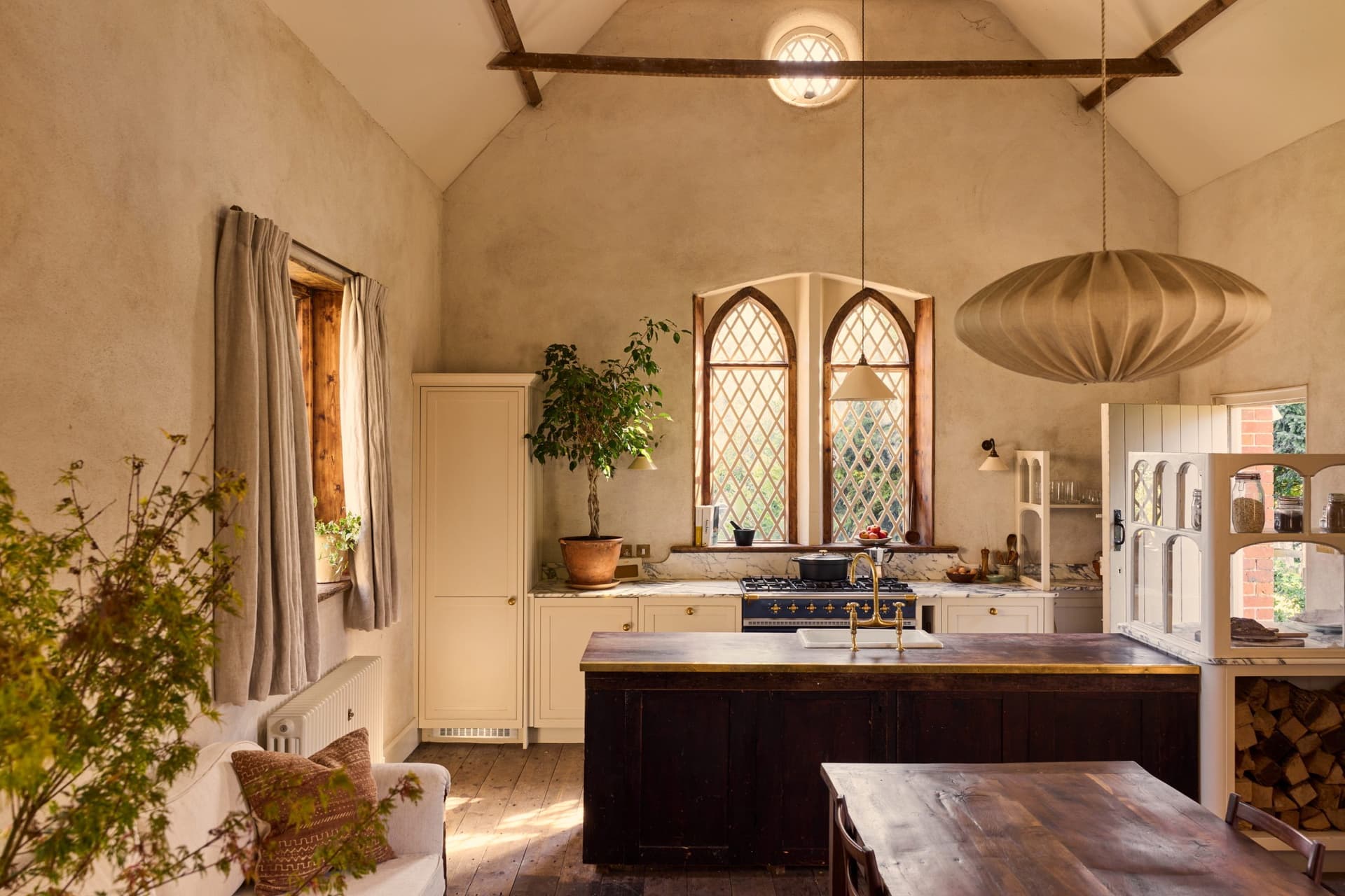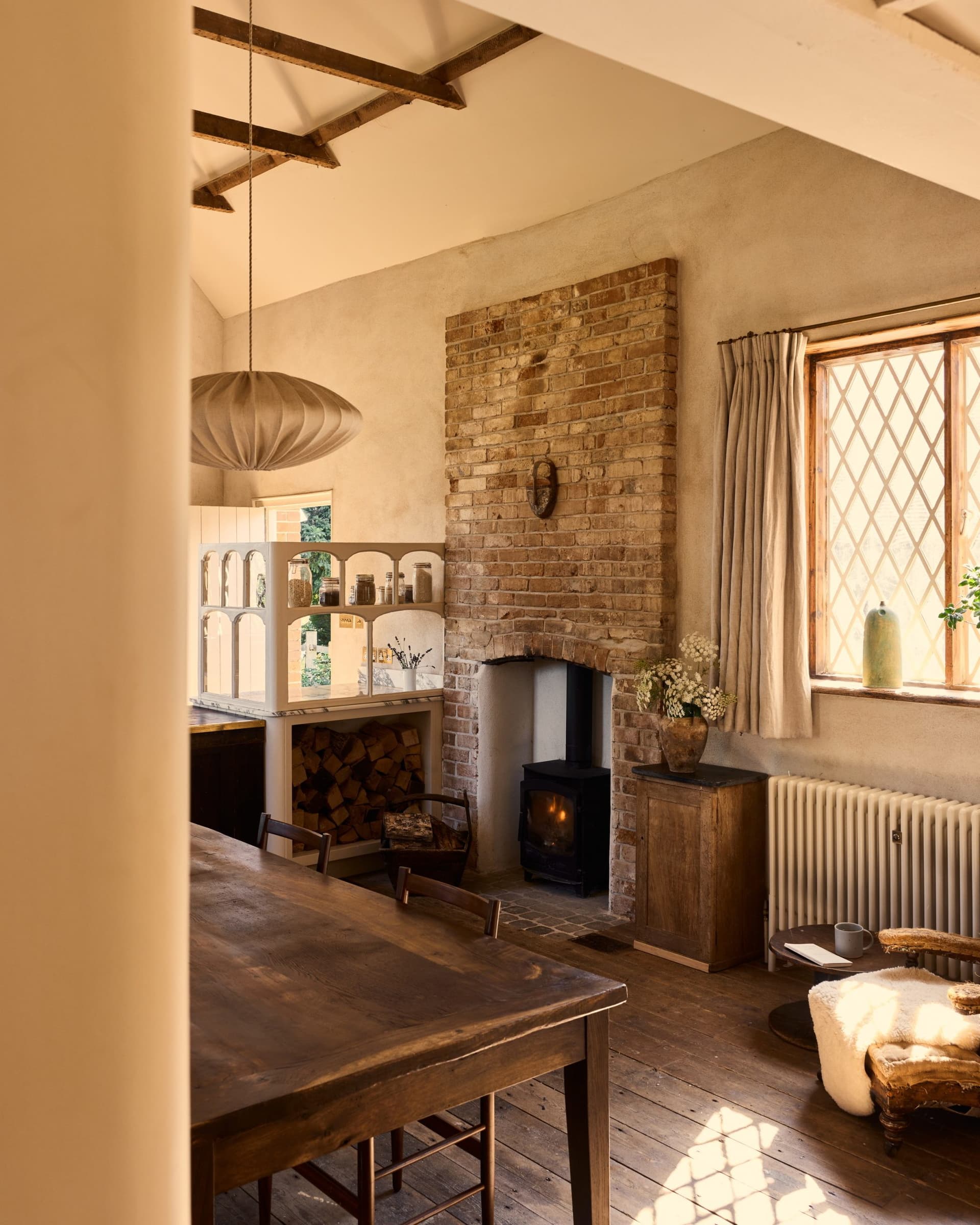Two cottages and an old school hall — 250 years in the making — now reunited and renewed as a rustic family home in the North Hampshire Downs. Church View is a pastoral retreat in the British countryside — a composition by VOZA Developments that binds old and new with quiet conviction. A bespoke oak kitchen with a marble worktop sits alongside a vintage Belgian unit, original boards underfoot, a reclaimed Iroko worktop and a Belfast sink; the layering of reclaimed finishes and time-earned materials gives the room its character. The result is a space with texture, heritage and warmth — a calm, lived-in elegance that could only be achieved through age, restraint and thoughtful assembly.