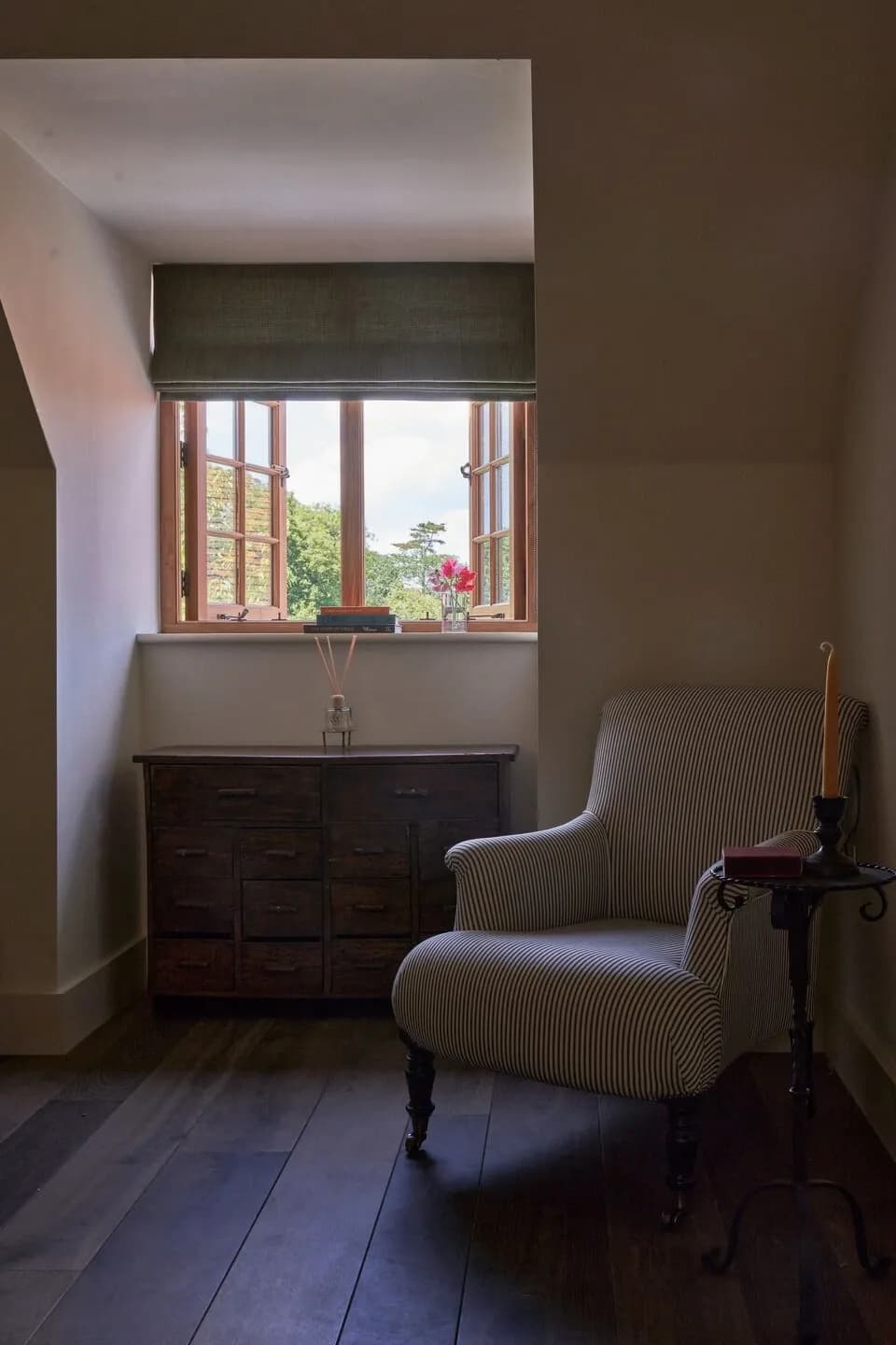 For this project, our Highland Manor oak was selected and supplied with a subtle hand-distressing to encourage a gently timeworn character from day one. The oak's mellow, natural tones sit easily among the raw materials and garden surroundings, ageing with dignity while retaining an enduring quiet elegance. It is a floor calibrated to feel rooted — not installed.