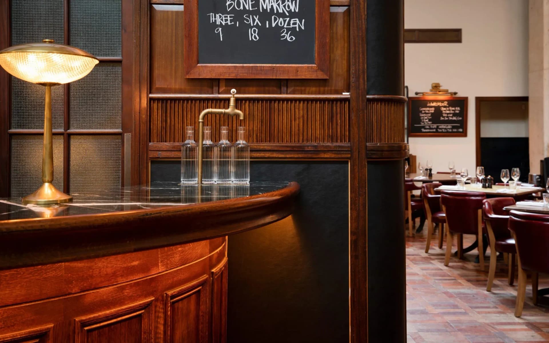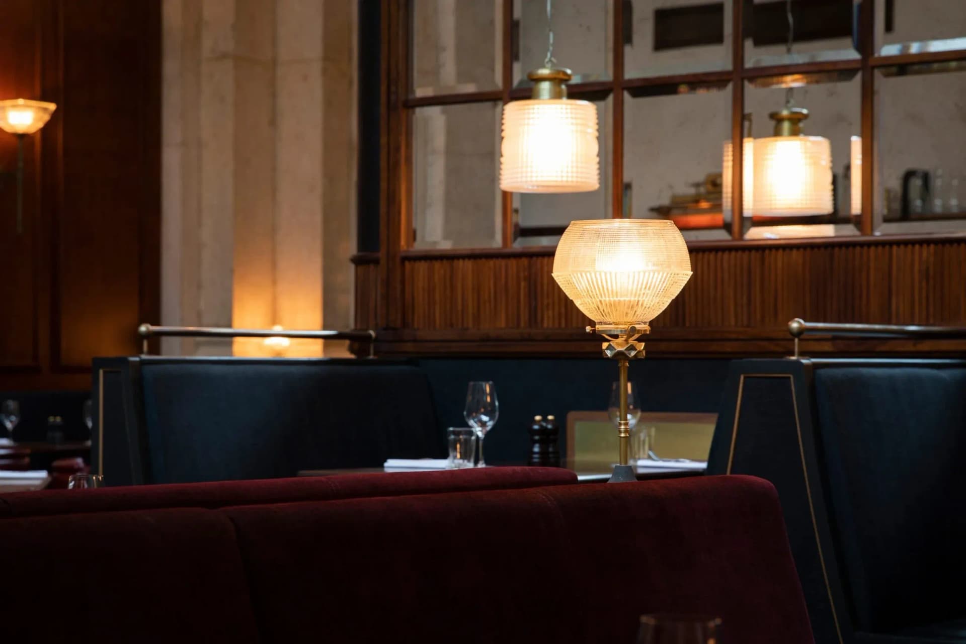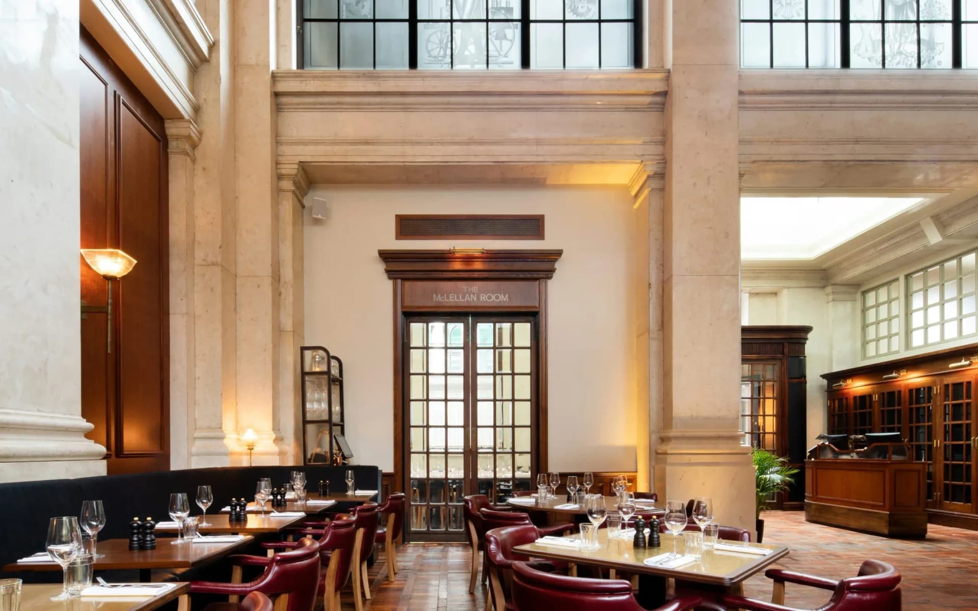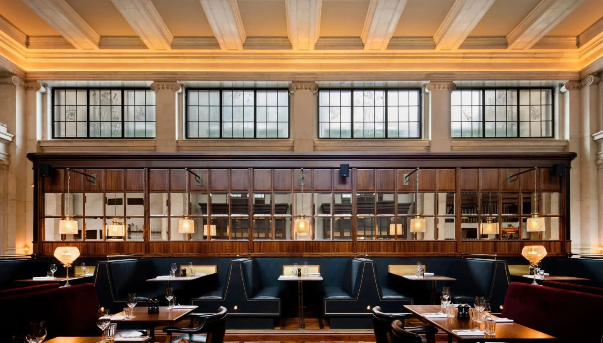 The main hall is gently broken down with a central island bar and wine room for more intimate dining. Limestone columns have been painstakingly restored and can now be appreciated up close from a new mezzanine. Reclaimed vintage furniture, repurposed doors and bespoke lights using original Holophane glass further reinforce the building’s layered authenticity.