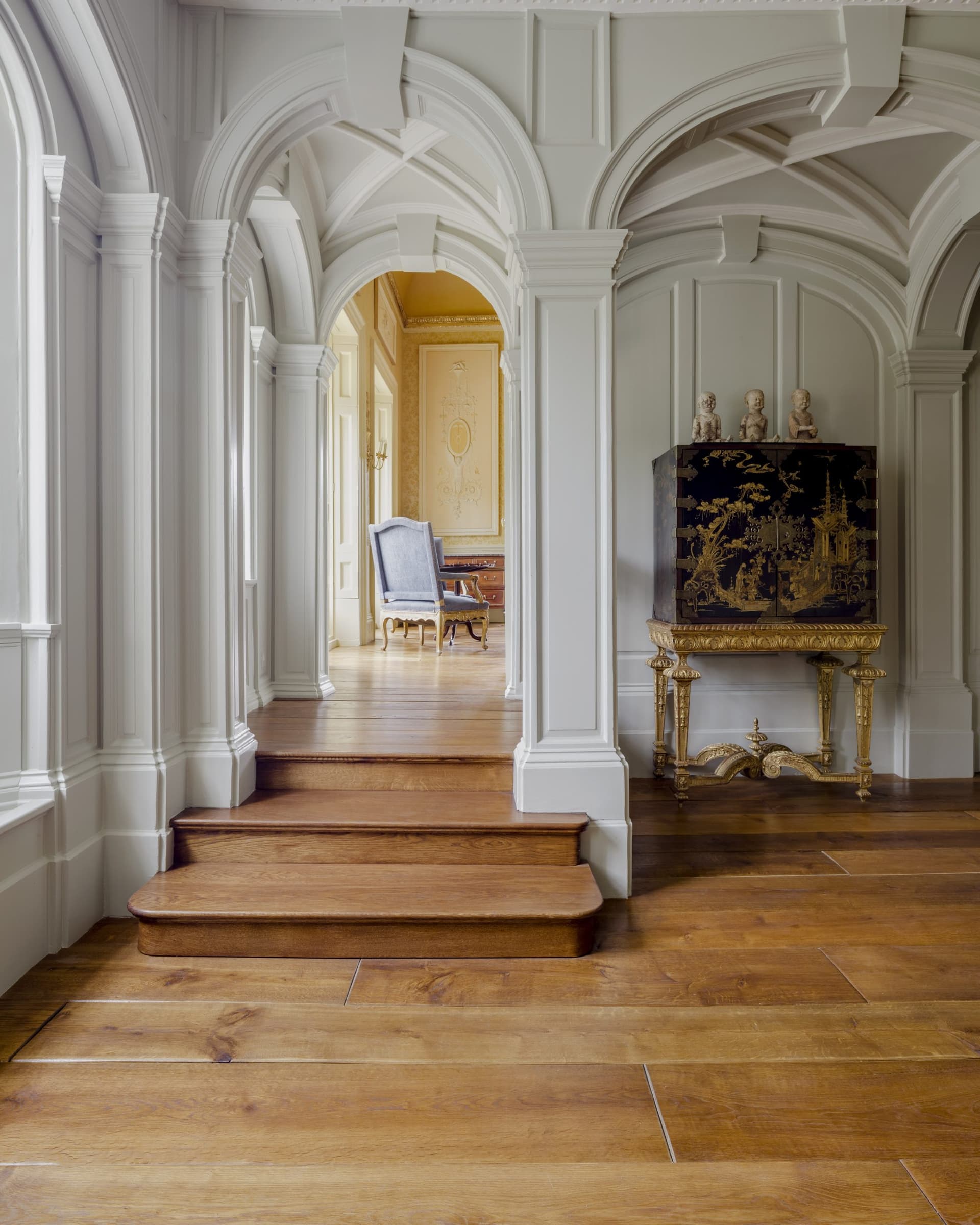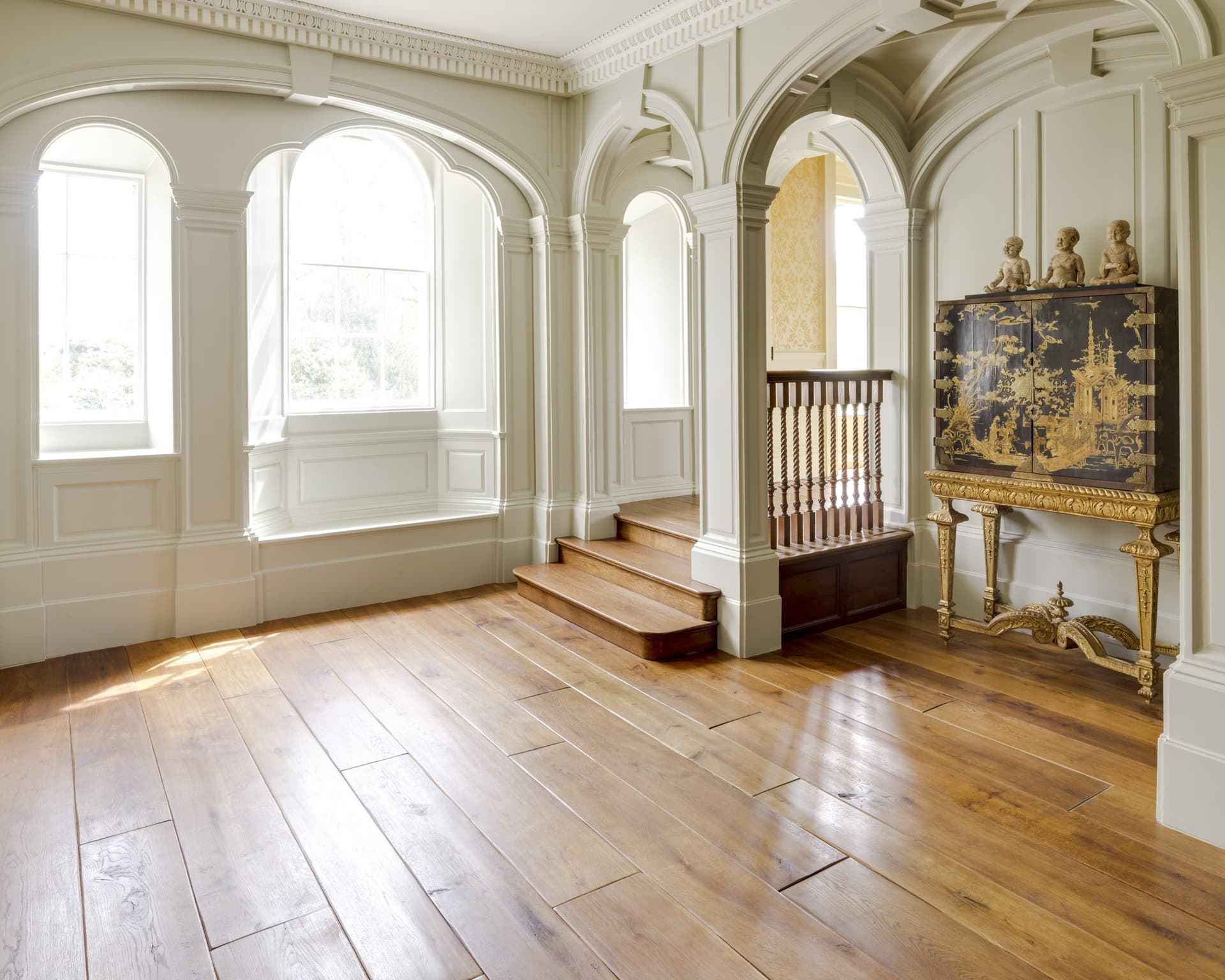 Widcombe Manor, a Grade I listed Georgian house in Bath, first built in 1656, has undergone a complete renovation featuring our Castle engineered platform. Because the entire property now runs on underfloor heating, every oak board had to be engineered — not solid — to ensure maximum stability without compromising depth or character. This is precisely what our Castle platform was developed for: a structurally superior engineered format built to the highest possible specification for heritage-scale restorations.