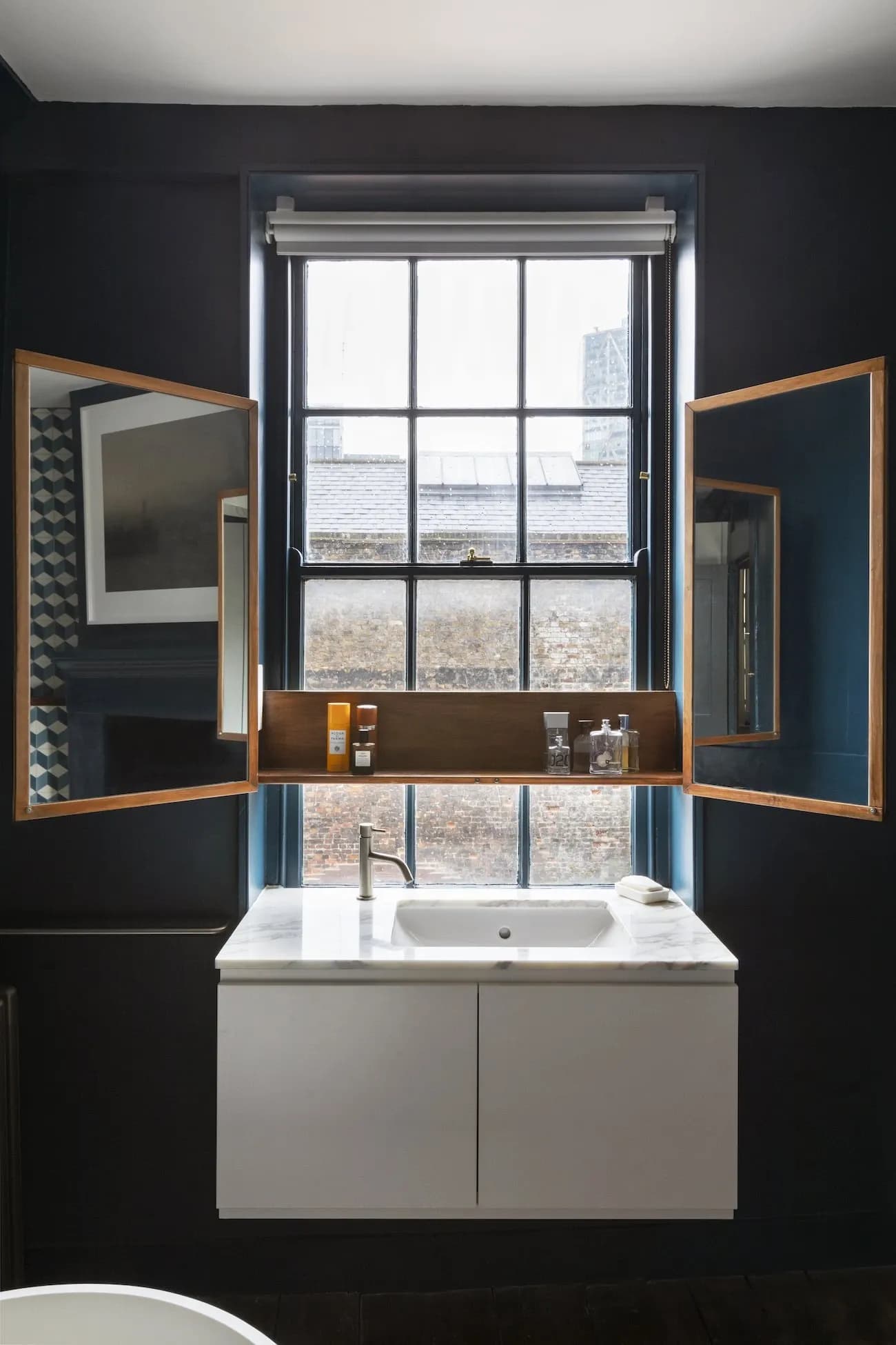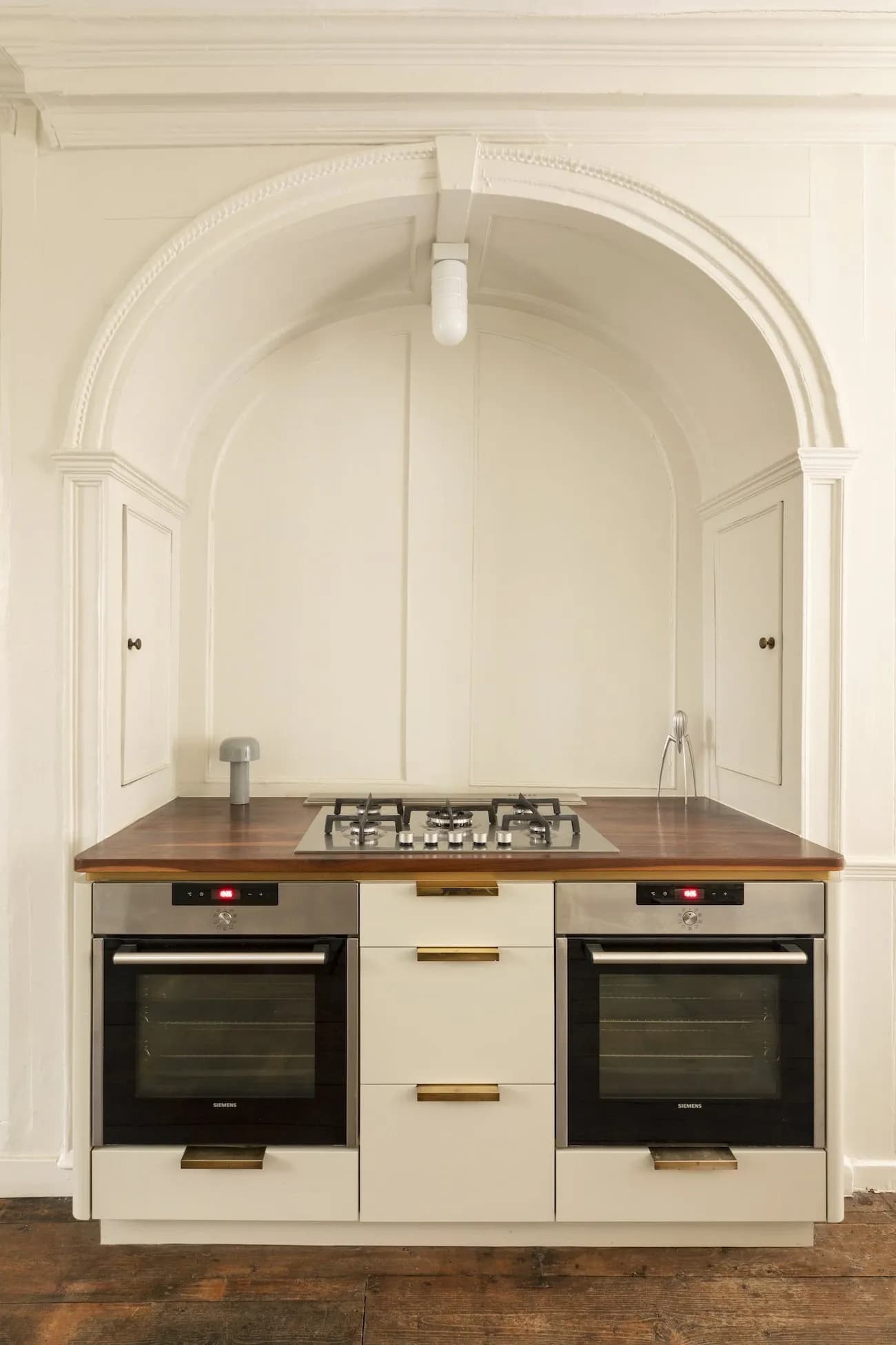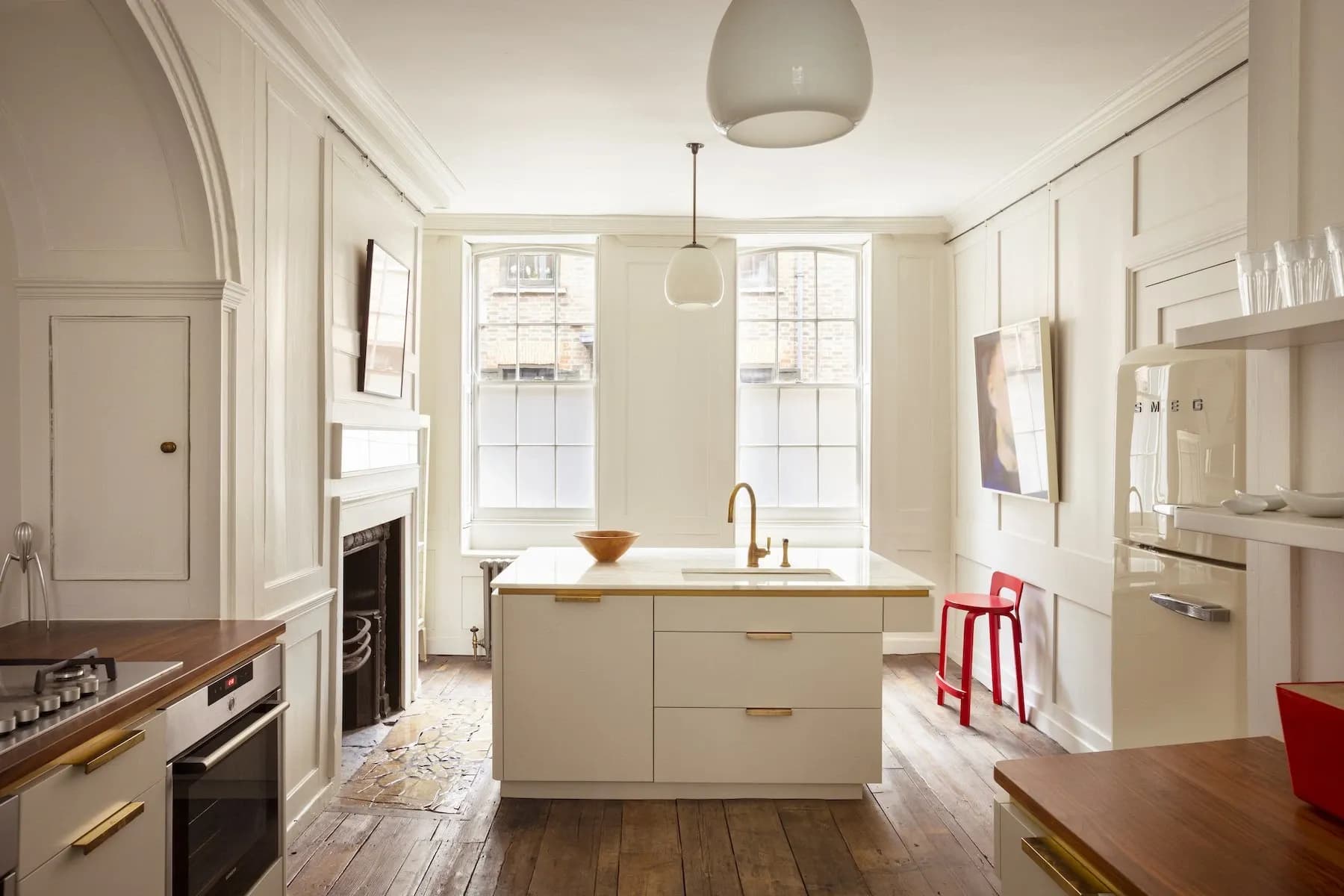 This 18th-century French Huguenot house in Spitalfields retains a remarkable suite of original features — timber partitions with panelling, refined cornicing, and ornate architraves — all protected within its Grade II listing. The client’s brief put preservation first: every period element was to remain untouched, and any new intervention would be treated as a removable piece of “furniture” rather than an alteration to the fabric. Two kitchen elements were introduced with the restraint of a chest of drawers — freestanding, minimal, and fully reversible — ensuring that the new reads as a gentle guest within a historic structure rather than an imposition upon it.